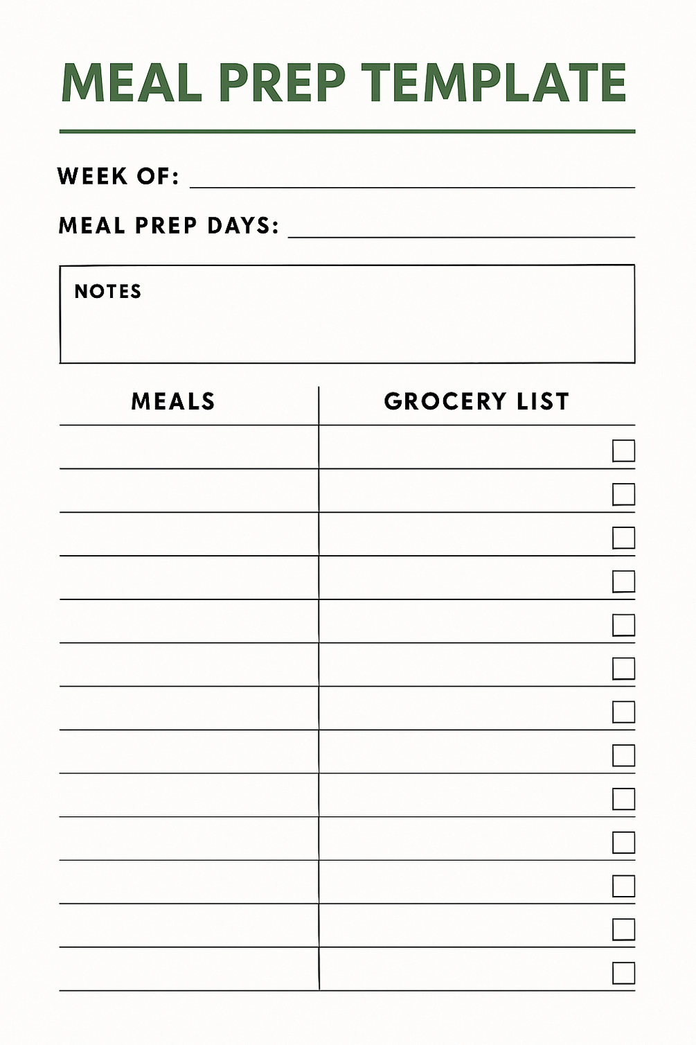 Whether you're hitting the gym, working long hours, or managing a packed schedule, this printable Meal Prep Template makes it easy to plan your weekly meals and grocery list in one place.